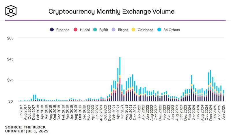 2日(現地時間)、アンフォールディッドはX(旧Twitter)を通じて「先月6月、中央化取引所の現物取引量は1兆700億ドルを記録し、9か月ぶりの最低水準に達した」と発表しました。