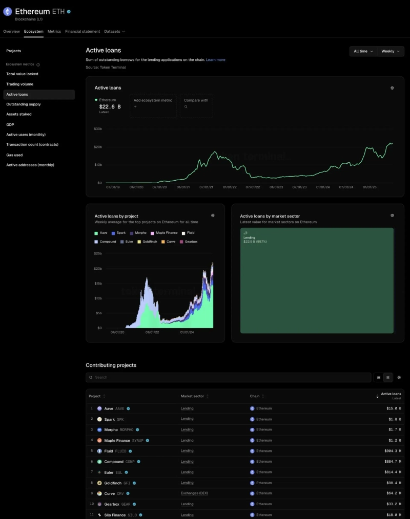 5日(現地時間)、トークンターミナルによると、現在イーサリアム貸付プロトコルのアクティブローン規模は226億ドル(約31兆ウォン)を記録し、過去最高を更新した。