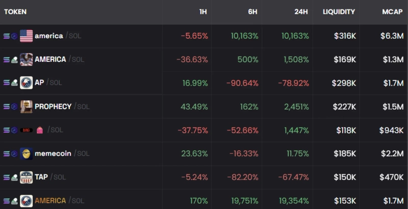 このランキングで1位を記録しているamericaは、約4時間前に誕生したばかりの新しい仮想資産だが、わずか4時間で1万%を超える上昇率を記録した。現在、このミームコインの時価総額は630万ドルだ。