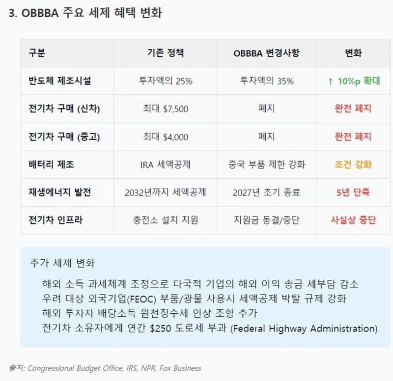 - OBBBAによって半導体分野は米国の税額控除拡大の恩恵を受けたが、EV・バッテリーなどのグリーン産業は補助金縮小で需要減少懸念が高まったと述べている。