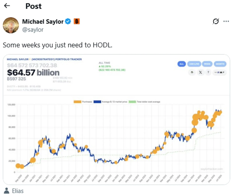 6日(現地時間)、セイラーはX(旧Twitter)を通じて「セイラー・トラッカーチャート」を投稿し、「ある週はHODLだけすべきだ」と述べました。