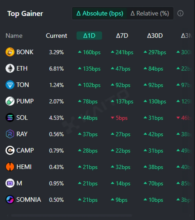 - AIベースのWeb3検索プラットフォームKaitoのトークンマインドシェア指標によれば、現在最も注目を浴びている仮想資産はボンク、イーサリアム、トンコイン、パンプファン、ソラナなどだとしています。