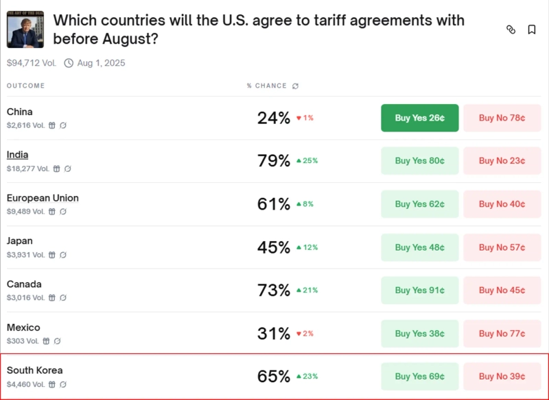 - 分散型予測市場「Polymarket」によると、韓国が米国と関税交渉を締結する確率が65%に集計されたと伝えられた。