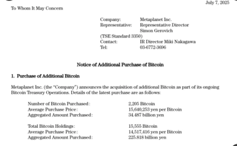 7日(韓国時間)、メタプラネットはX(旧ツイッター)を通じてビットコイン2,205個を購入したことを発表しました。