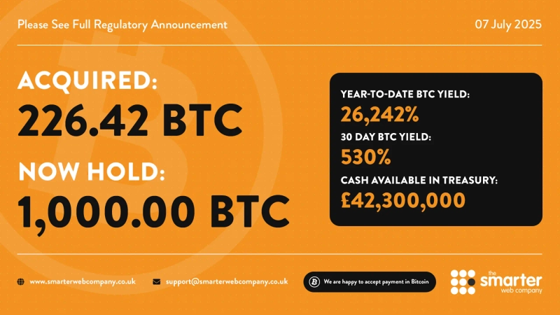 英国の上場企業スマーター・ウェブ・カンパニーが、226ビットコイン(BTC)相当を追加で購入したことが明らかになりました。