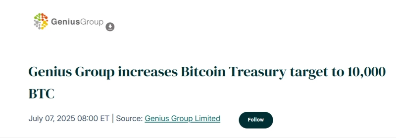 7日(現地時間)、グローブニュースワイヤーによれば、ジーニアスグループはプレスリリースで「ビットコイン保有目標を従来の1,000BTCから1万BTCへと引き上げた」とし、「今後12~24ヶ月以内に目標数量に到達する計画」だと明らかにしました。