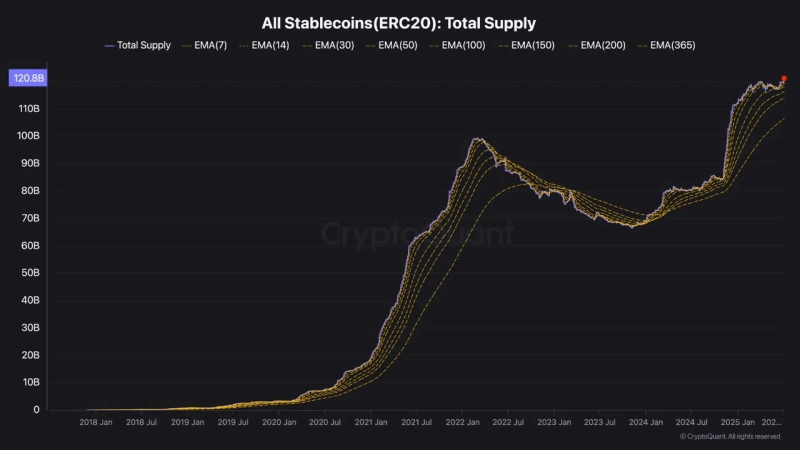 8日(韓国時間)、ダークポスト・クリプトクアントの寄稿者はレポートを通じて「イーサリアム標準ステーブルコインの供給量が1,208億ドルで過去最高を記録した」とし、「これはイーサリアムエコシステムが依然として活発であることを示している」と分析した。