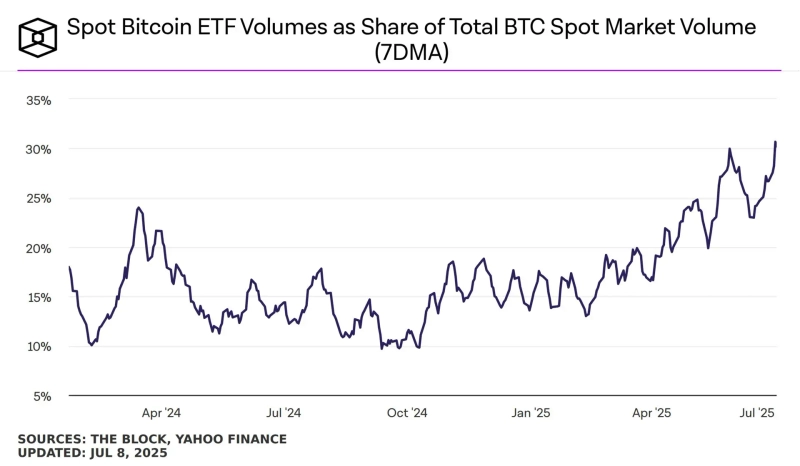 添付された資料によると、ビットコイン現物市場全体の取引量に占めるビットコイン現物ETFの取引量は着実に増加し、30%を突破しました。