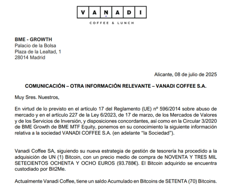 スペインのコーヒーチェーン「バナディ」がビットコイン(BTC)1枚を追加取得したことが明らかになった。