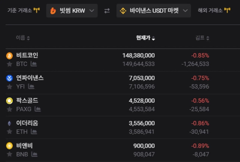 現在、アップビットKRWマーケット内でのビットコイン価格は1億4835万ウォンで、バイナンステザー(USDT)マーケット価格の1億4951万ウォンより、約0.78%安い。ビッサムKRWマーケット内のビットコイン価格も1億4837万ウォンで、アップビットと同水準だ。