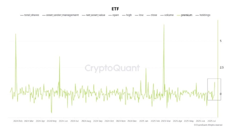 12日(韓国時間)、CryptoQuant寄稿者CryptoOnchainはレポートで「最近、ビットコインETFのプレミアムが2025年7月3日の約-0.53%から7月11日には1.14%へと大きく上昇し、その期間中にビットコイン価格も117,000ドルまで上昇し、主要なレジスタンスラインを突破した」と伝えました。