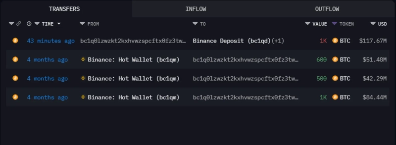 12日(韓国時間)、オンチェーンレンズはエックス(旧ツイッター)を通じて「4ヶ月間休眠状態だったクジラアドレスがバイナンスにビットコイン(BTC)1,000個を入金した」と伝えた。