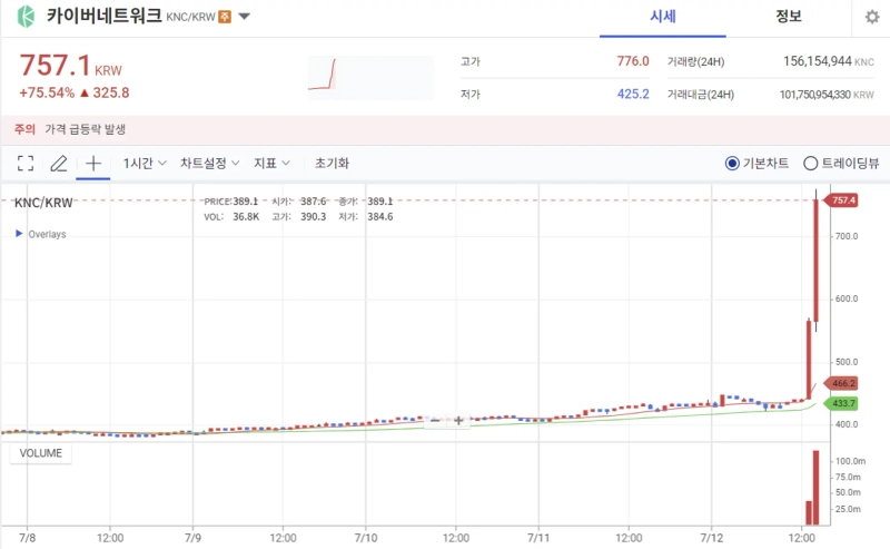 12日(韓国時間)午後2時36分現在、カイバーネットワークは国内暗号資産取引所アップビットで前日比75.54%急騰の757.1ウォンで取引されています。