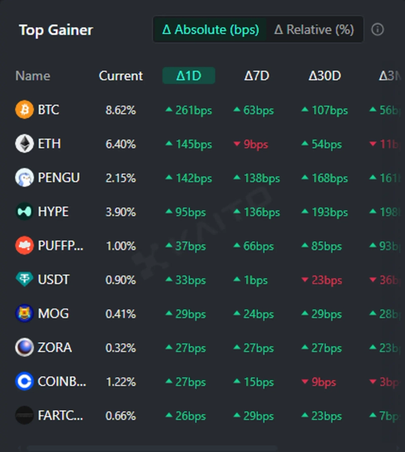 AIベースのWeb3検索プラットフォーム「Kaito」のトークンマインドシェア(Token Mindshare、仮想資産市場内で特定トークンの影響力を数値化した指標)トップゲイナーによれば、14日現在、人々が最も注目している仮想資産関連キーワード上位5つはビットコイン(BTC)、イーサリアム(ETH)、パッジーペンギン(PENGU)、ハイパーリキッド(HYPE)、パフポ(PUFFPAW)などとなっている。