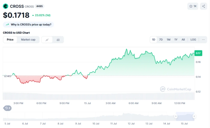 15日(韓国時間)の午後1時58分現在、クロスは前日比23.02%上昇の0.1718ドルを記録している。