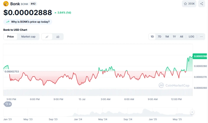 15日(韓国時間)午後2時6分現在、ボンクはコインマーケットキャップ基準で前日比3.84%上昇した0.00002888ドルを記録しています。