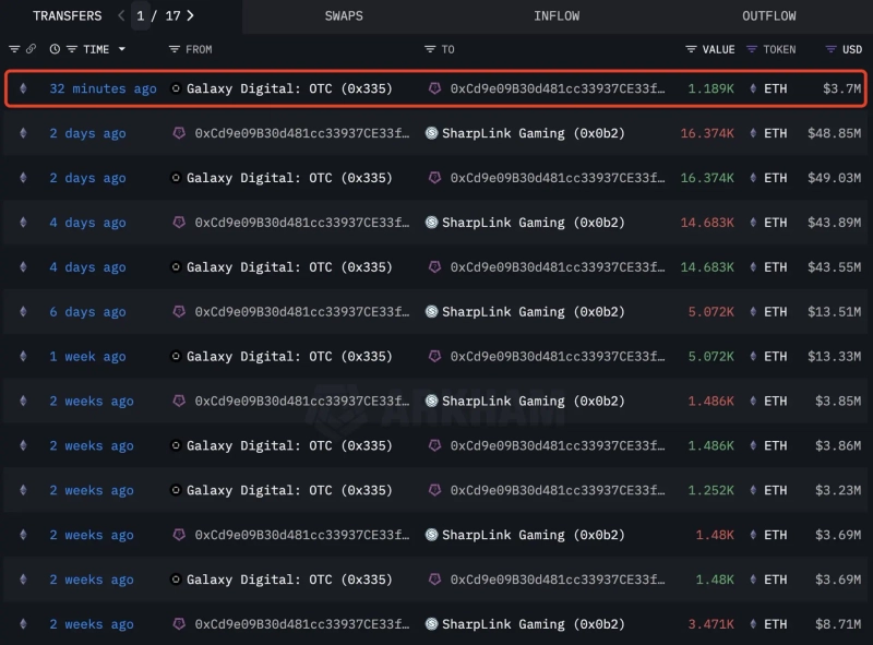 - SharpLink Gamingが6377ETHを追加で買い増ししたとLookonchainが伝えました。