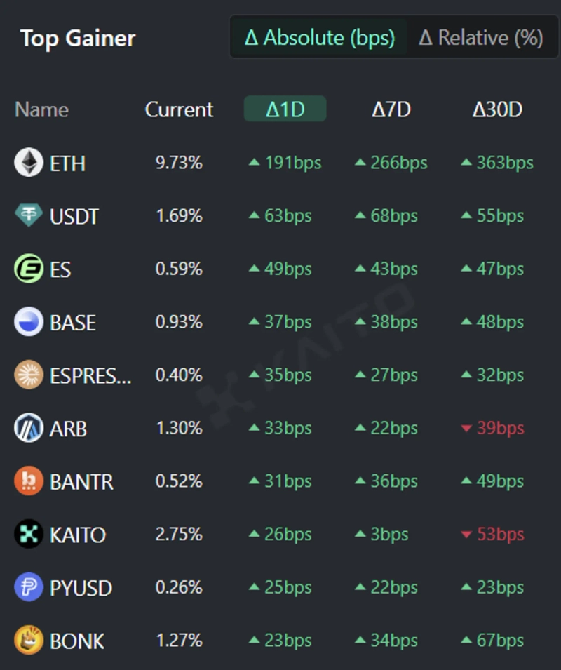 AIベースのWeb3検索プラットフォームであるカイト(Kaito)の「トークン・マインドシェア」(Token Mindshare、仮想資産市場内で特定トークンの影響力を定量化した指標)によると、17日現在、人々が最も関心を示している仮想資産関連キーワード上位5つはイーサリアム(ETH)、テザー(USDT)、イクリプス(ES)、Base(Base)、Espresso(Espresso)などです。