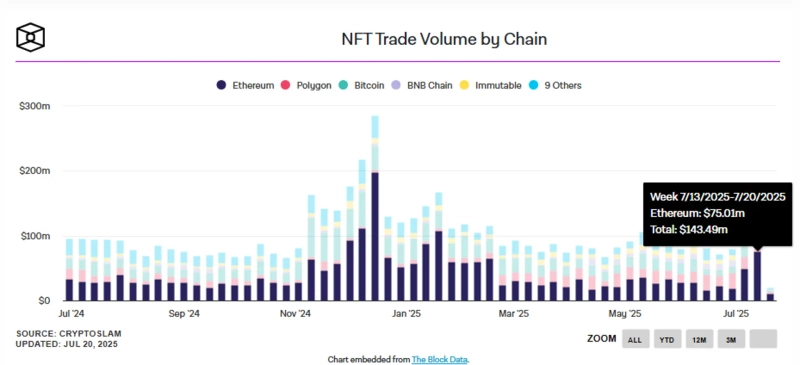 21日(韓国時間)、仮想資産(暗号通貨)専門メディアThe Blockは、CryptoSlamのデータを引用し、7月第3週の全ブロックチェーンのNFT取引量が1億4,350万ドルを記録したと報じました。これは今年1月以来、約6か月ぶりの最高値となります。