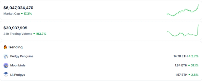 - NFTの総時価総額が前日比17.3%増で60億47000万ドルを記録したと伝えられている。