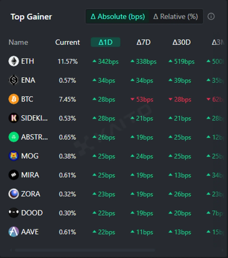 - Kaitoのトークンマインドシェア指標によると、Ethereum(ETH)、Etena(ENA)、Bitcoin(BTC)などが投資家の主な注目コインとして挙げられている。