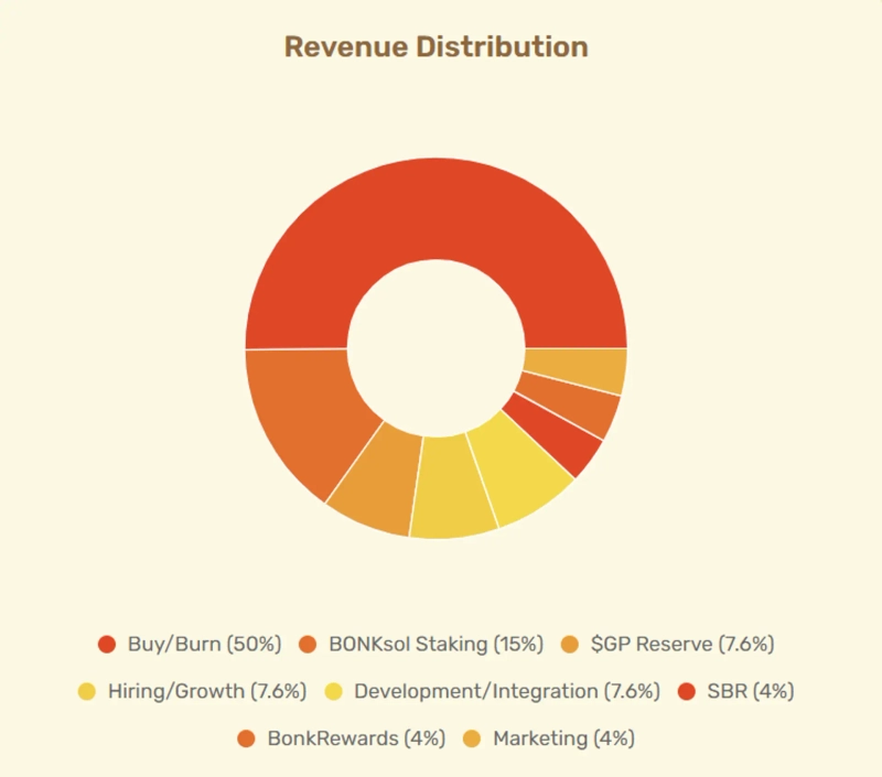 レッツボンクファンの人気がBONKの価格にプラスの影響を与えている理由は、その独特な手数料システムにあります。レッツボンクファンはプラットフォーム内の全ての取引でSolana(SOL)による1%の手数料を課します。この手数料の50%はBONKトークンのバイバック(buy back、自社トークン買い増し)およびバーンに使われます。レッツボンクファンの利用が増えるほどBONKトークンの供給量が減少し、価格の上昇圧力が強まるのです。