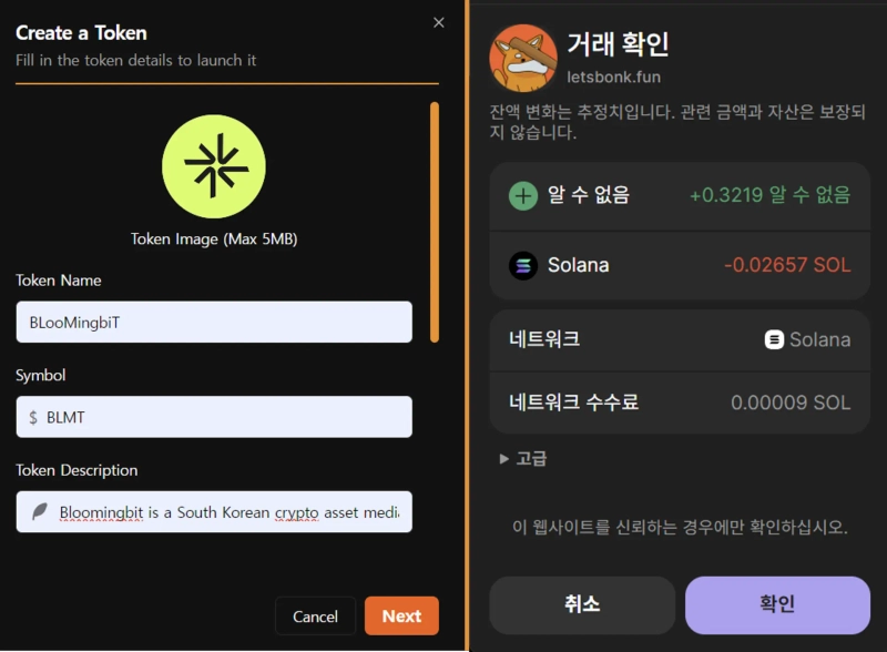 記者が実際にレッツボンクファンを使ってみました。使い方は他のトークンローンチパッドと同様でした。レッツボンクファンにソラナ基盤のウォレット「Phantom」を接続し、手数料を含む生成費約5,000ウォンを支払いました。その後、名前・画像・ティッカー(Ticker)などミームコインの生成に必要な情報を入力するだけで、トークンが簡単に作成されました。