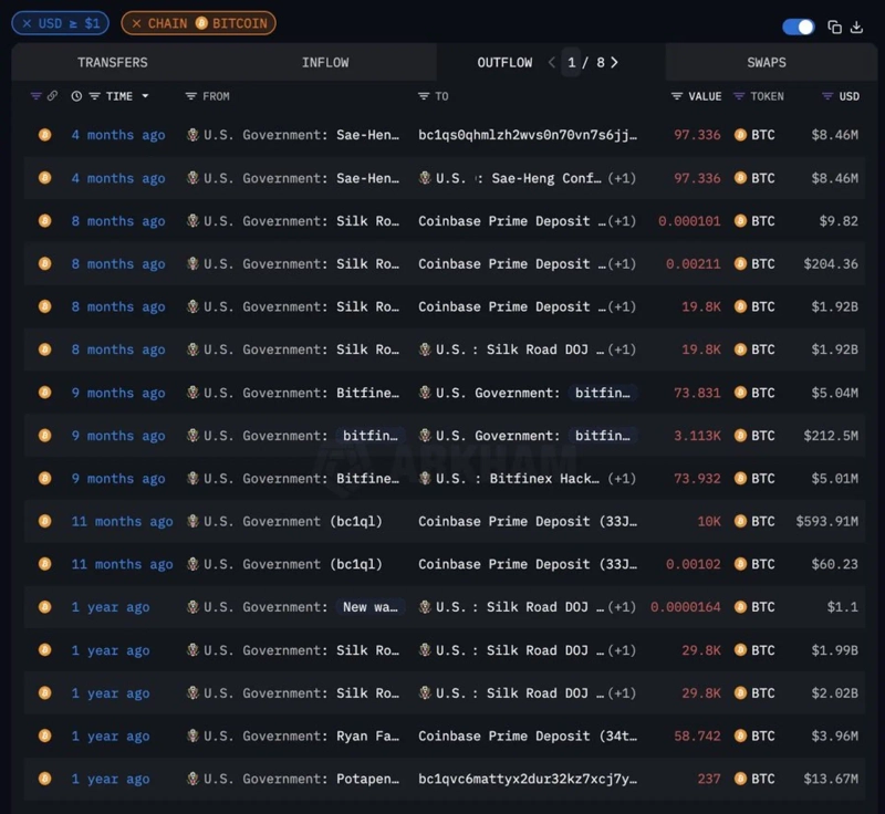 24日(現地時間)、Wu Blockchainが引用したArkhamのデータによると、米国政府は現在、合計19万8,000BTC(約235億ドル)をさまざまな機関名義のウォレットに分散保有しており、その数量はこの4か月間一度も移動されていない。