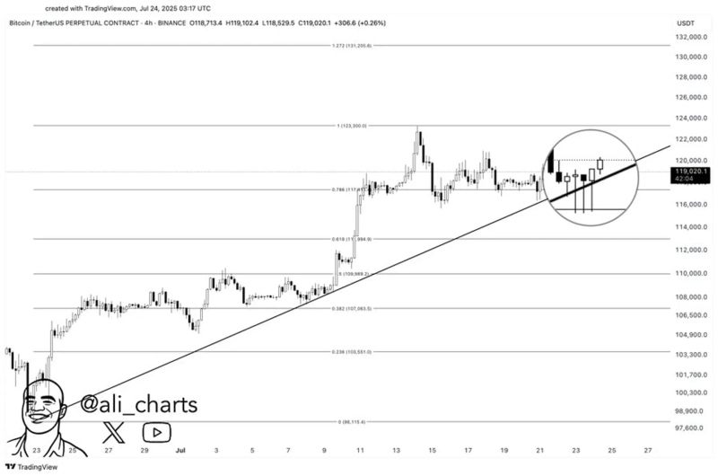 24日(現地時間)、仮想資産(暗号通貨)アナリストのアリ・マルティネスはXにて「11万7400ドルの支持線を安定して守っている。この区間で買い増し圧力が加われば13万1000ドルまで上昇する可能性がある」と述べました。