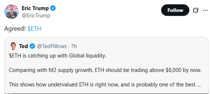 24日(現地時間)、エリック・トランプは自身のX(旧Twitter)で、イーサリアムの可能性について論じた投稿をリツイートし、「同意する」と述べた。