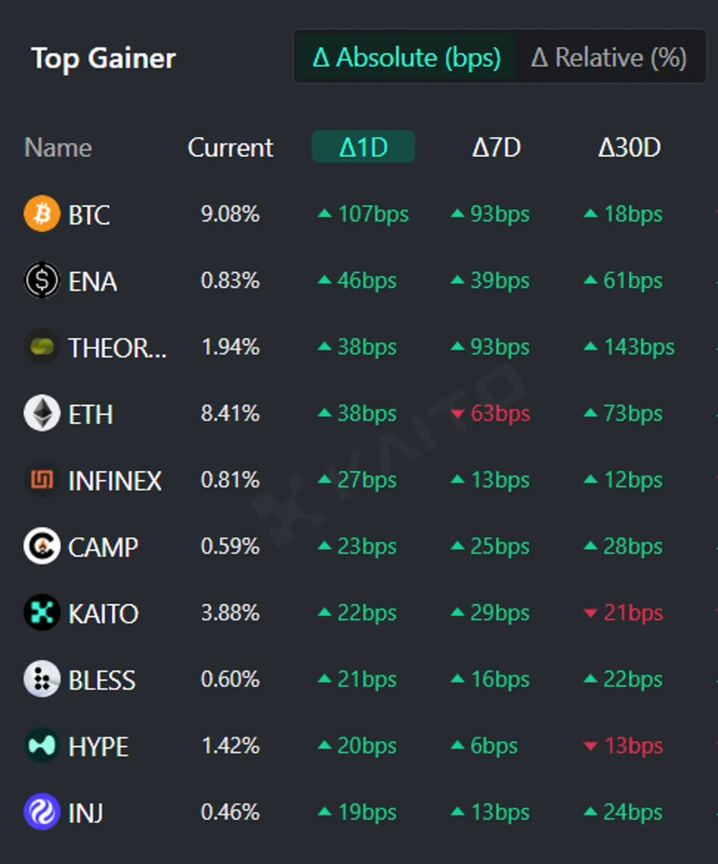AIベースのWeb3検索プラットフォームKaito(Kaito)のトークンマインドシェア(Token Mindshare、仮想資産市場内の特定トークンの影響力を定量化した指標)トップゲイナーによると、26日現在で人々が最も関心を示している仮想資産関連キーワードの上位5つはビットコイン(BTC)、エテナ(ENA)、Theoriq(Theoriq)、イーサリアム(ETH)、Infinex(Infinex)などである。