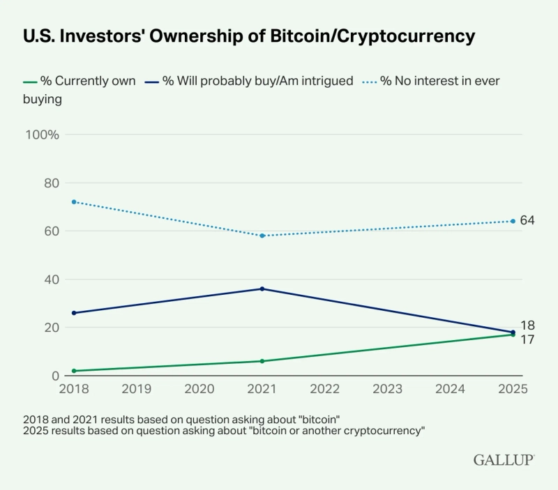 ドナルド・トランプ米大統領の積極的な親暗号資産政策にもかかわらず、依然として暗号資産が一般的な投資手段として定着していないという分析だ。ギャラップは「現状の認識からは、暗号資産に対する馴染みのなさと収益実現の可能性への懸念が、依然として暗号資産が日常的な投資手段として根付く障害となっていることが示唆される」と述べた。