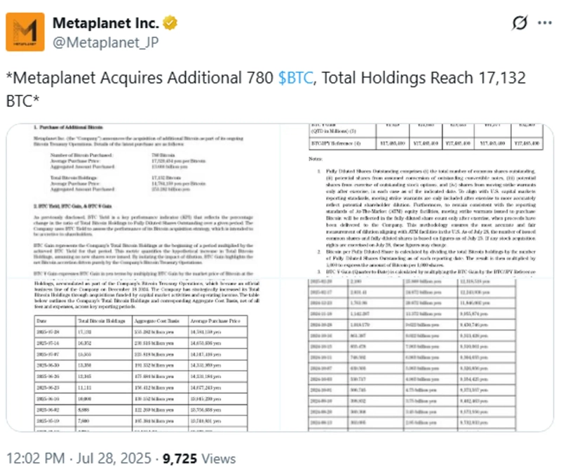 28日(韓国時間)、メタプラネットは公式X(旧Twitter)を通じて「ビットコイン(BTC)790個を追加購入した」と発表しました。