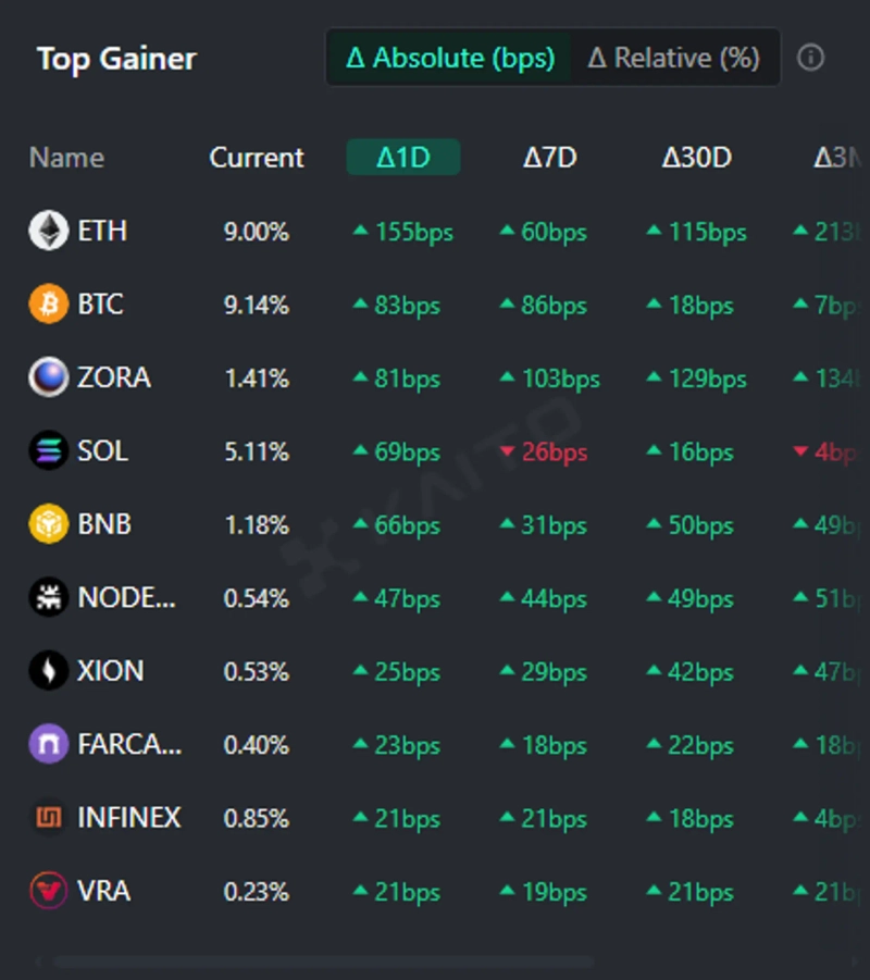 - Kaitoのトークンマインドシェアトップゲイナーによると、現在投資家から最も注目を集めているのはイーサリアム(ETH)、ビットコイン(BTC)、ゾラ(ZORA)、ソラナ(SOL)、バイナンスコイン(BNB)の5つである。