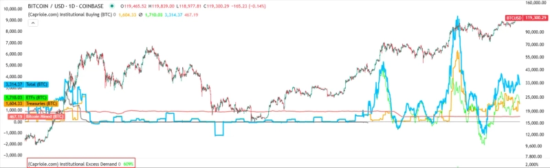 実際、Capriole Investmentsが提供したチャートによると、この日のビットコイン日次マイニング量は467.19BTCで、機関投資家によるビットコインの購入量はマイニング量より609%多い3,314.37BTCとなりました。上場投資信託(ETF)では1,710.03BTCが純流入し、ビットコイン財務戦略会社が1,604.33BTCを購入しました。