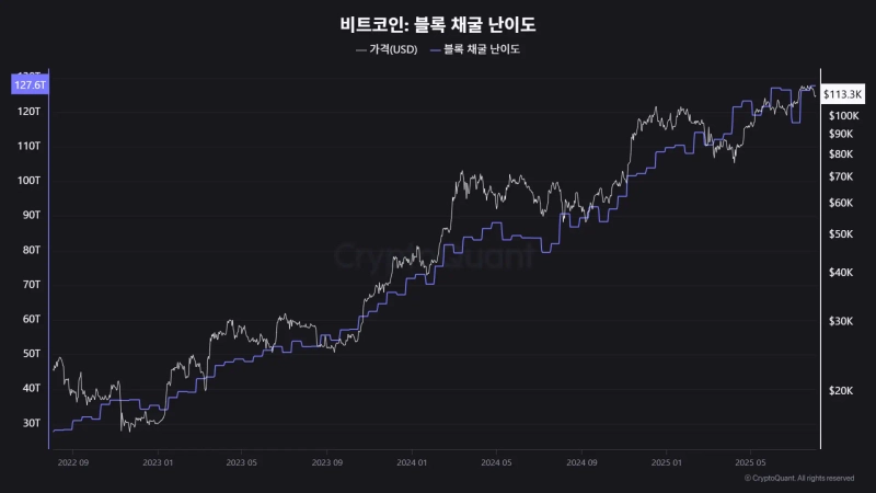 3日(現地時間)、オンチェーンデータプラットフォームのクリプトクアントによると、ビットコインのマイニング難易度は約127.6Tとなり、これまでで最も高い値を記録しました。マイニング難易度は6月から7月にかけては下降傾向となりましたが、7月末以降は長期的な上昇傾向に戻った様子が見られます。
