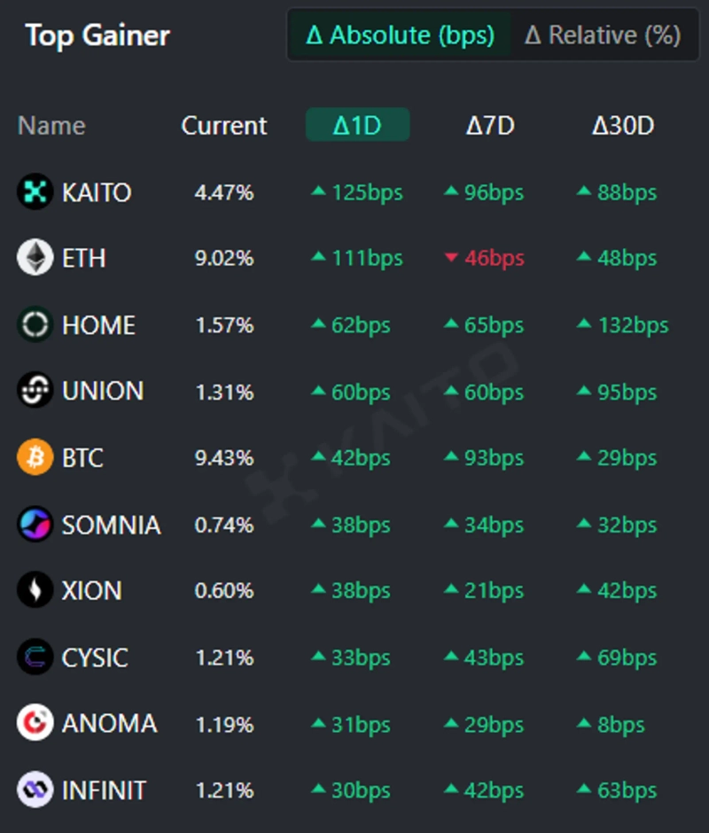 AIベースのWeb3検索プラットフォームKaito(カイト)のトークンマインドシェア(Token Mindshare、暗号資産市場内で特定トークンの影響力を定量化した指標)トップゲイナーによると、2日現在で人々が最も注目している暗号資産関連キーワードにはイーサリアム(ETH)、ビットコイン(BTC)、DeFiアプリ(HOME)、Kaito(KAITO)などがあります。