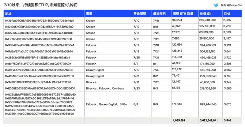 9日(現地時間)、エンバーCNによると、先月7月10日から1ヶ月間で多数の匿名クジラおよび機関投資家が合計103万5000ETH(約41億6700万ドル)を買い集めた。