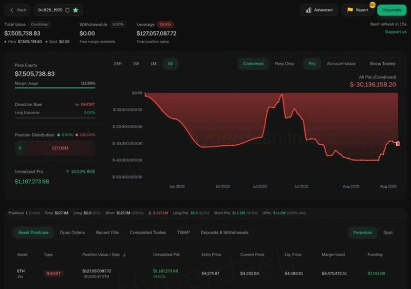 12日(韓国時間)、エンバーCNによると、ハイパーリキッドの著名なクジラであるアギラトレードは昨夜、イーサリアム(ETH)3万ETHのショートポジションを開始しました。エントリー価格は4,274ドルです。