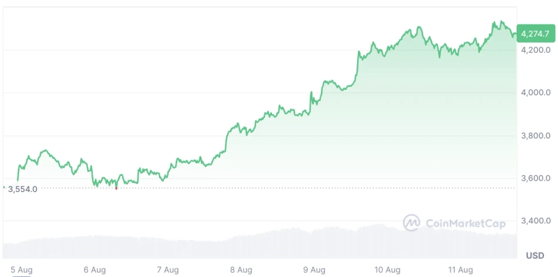 仮想資産市況サイトCoinMarketCapによると、10日時点でイーサリアム価格は2021年12月以来約4年ぶりに4,300ドルを突破し、12日現在では4,310ドル台で取引されている。1週間前と比べて約20%急騰した数値である。