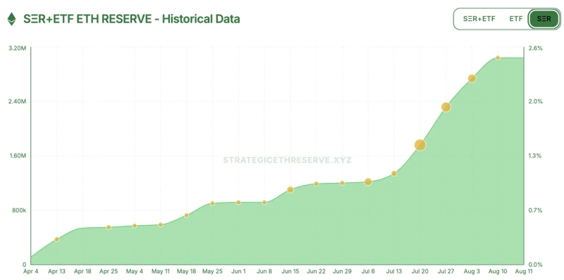 イーサリアム上昇の背景は複合的だ。まず米国を中心に企業によるイーサリアム備蓄が本格化したことが主な推進力として挙げられる。米暗号資産マイニング企業BitMineが代表的な例だ。BitMineは最近「イーサリアム版戦略」を掲げてイーサリアムの備蓄を本格化した。Strategic ETH Reserveによると、BitMineが確保したイーサリアムは本日時点で35億ドル(約4兆9,000億₩)規模であり、イーサリアム保有量だけでみると世界上場企業1位だ。