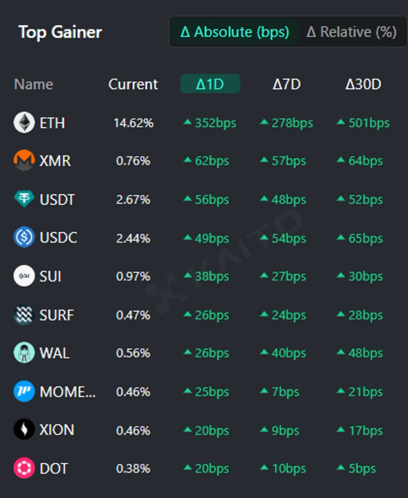AI(人工知能)ベースのWeb3サーチプラットフォームKaito(Kaito)のトークン・マインドシェア(Token Mindshare、仮想資産(暗号資産)市場内で特定トークンの影響力を定量化した指標)トップゲイナーによると、12日現在、人々が最も注目している仮想通貨はイーサリアム(ETH)、モネロ(XMR)、テザー(USDT)、USDC、スイ(SUI)などです。