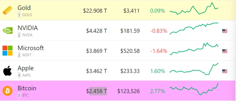 14日午前8時49分、CompaniesMarketCapデータによると、ビットコインの時価総額は約2兆4580億ドルを記録し、グーグル(約2兆4500億ドル)を上回ってグローバル資産ランキングで5位に浮上しました。