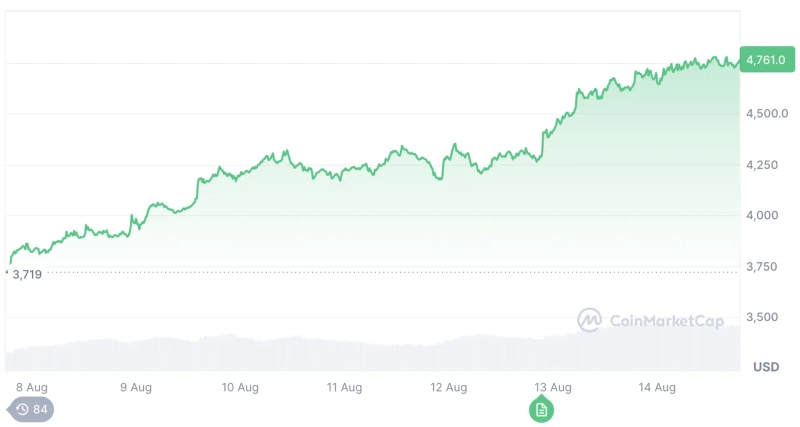 市場が注目しているのは、SharpLink Gamingのイーサリアム投資収益率です。SharpLink Gamingがイーサリアム備蓄を宣言した今年5月末、イーサリアムは2,500ドル台で取引されていました。SharpLink Gamingが本格的にイーサリアムを購入し始めた今年6月と7月もイーサリアムの価格はそれぞれ2,000ドル台、3,000ドル台でした。イーサリアムはこの日現在、CoinMarketCapで前日比約2%上昇し4,700ドル台で取引されています。