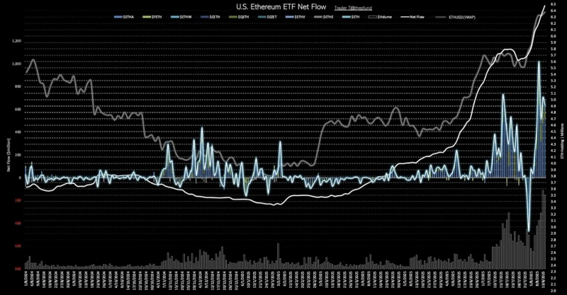 米国のイーサリアム(ETH)現物ETFは14日(現地時間)、総額6億3974万ドルの資金純流入を記録しました。これは13日(7億432万ドル)に続き、史上2番目の規模となります。