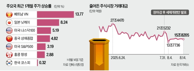 株式市場の活気を示す売買代金も減少傾向だ。先月の株式市場の1日平均売買代金は18兆7470億ウォンだったが、今月に入り16兆1674億ウォンまで減少した。今月4日には13兆ウォン水準まで落ち込んだ。7月31日の税制改正案発表後、投資心理が萎縮した結果だ。イ・ギョンミン大信証券リサーチャーは「国内株式市場が好材料と悪材料の両方に鈍感に反応し、3200ポイント台で様子見が続いている」と評価した。