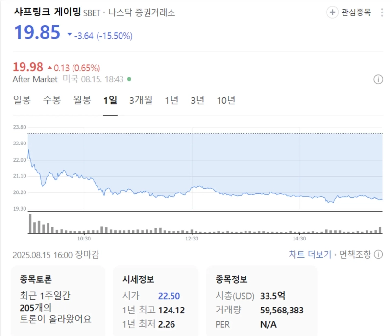15日(現地時間)、ニューヨーク証券取引所によると、シャープリンク・ゲーミングはこの日、前日比15.50%下落の19.85ドルで取引を終えました。