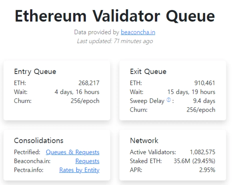 19日(韓国時間)、WuBlockchainはX(旧Twitter)を通じて、「現在イーサリアムのプルーフ・オブ・ステーク(PoS)ネットワークの退場待機列(アンステーキング待機列)には91万461ETHが積み上がっている」とし、「これは合計39億1,000万ドルに達し、過去最高値です」と伝えました。