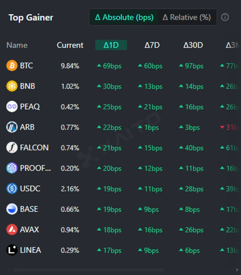 - カイトのトークンマインドシェア指標によると、投資家が最も注目しているビットコイン、バイナンスコイン、ピーク、アービトラム、ファルコンファイナンスがトップ5にランクインしました。