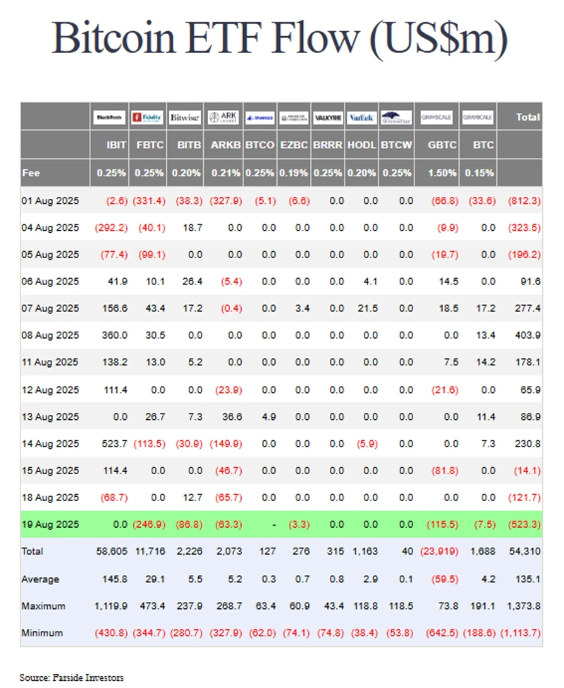 20日(現地時間)、Farside Investorsのデータによると、19日にビットコイン現物ETF商品では5億2330万ドルの資金が流出しました。最も多く資金が流出した商品はFidelityのFBTCで、約2億4690万ドルが流出し、続いてGrayscaleのGBTCが1億1550万ドルでした。